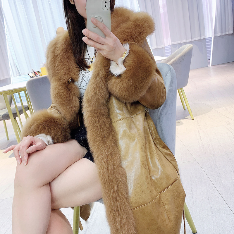 加厚外套 狐狸毛领女士皮草大衣真皮兔毛皮毛一体中长款 冬季 新款
