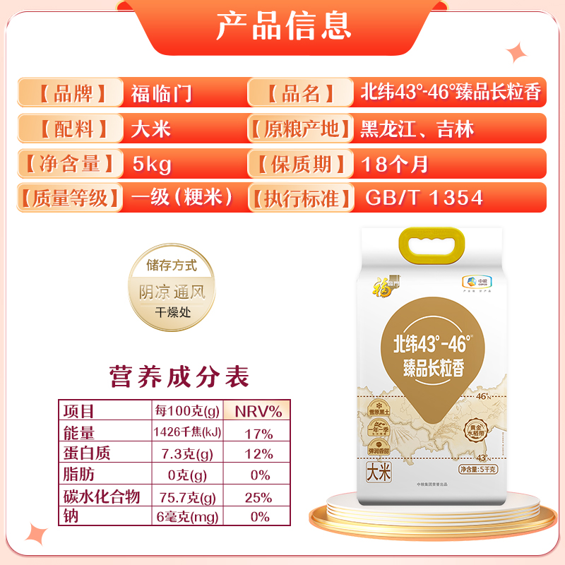 福临门北纬43°长粒香5kg东北大米优质一等大米官方旗舰店10斤