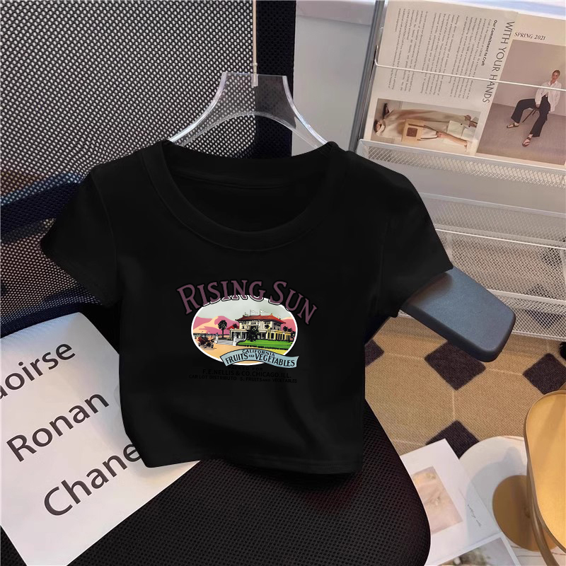 t恤女2025夏季 短款 新款 小衫 百搭上衣ins 圆领修身 白色正肩棉质短袖