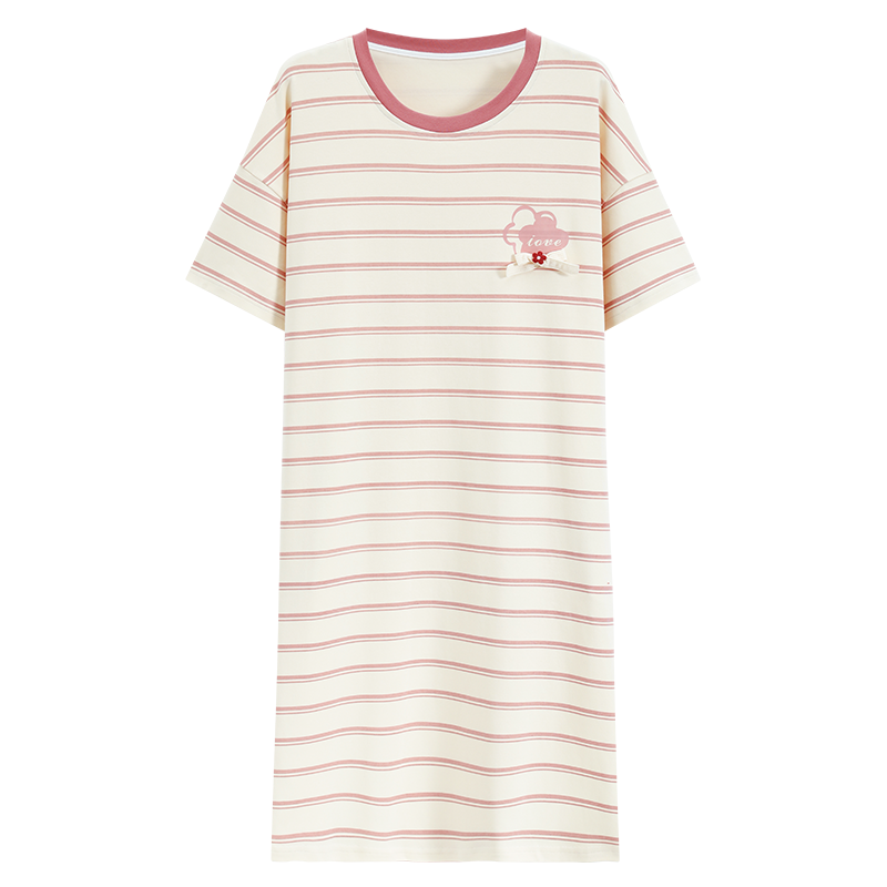 猫人100%全棉女士睡衣2025夏新短袖 连衣裙可外穿睡裙 条纹卡通长款