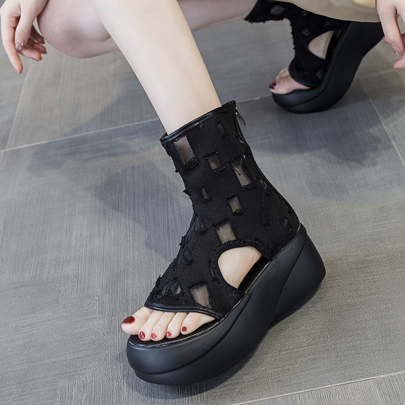 靴薄款 韩版 松糕厚底时装 夹趾透气镂空凉鞋 牛仔布破洞凉靴女夏新款