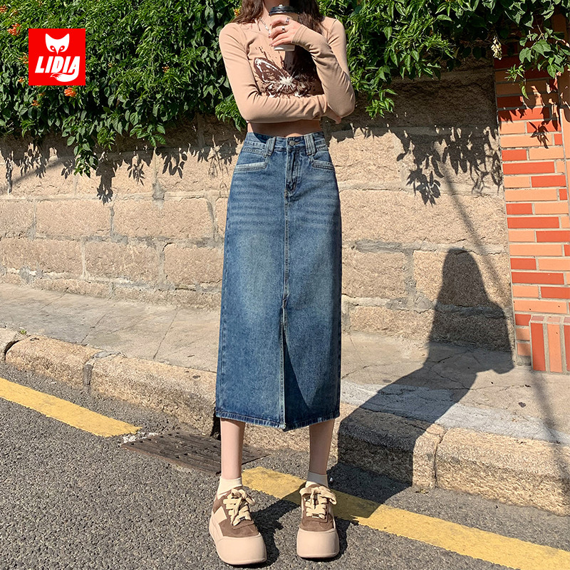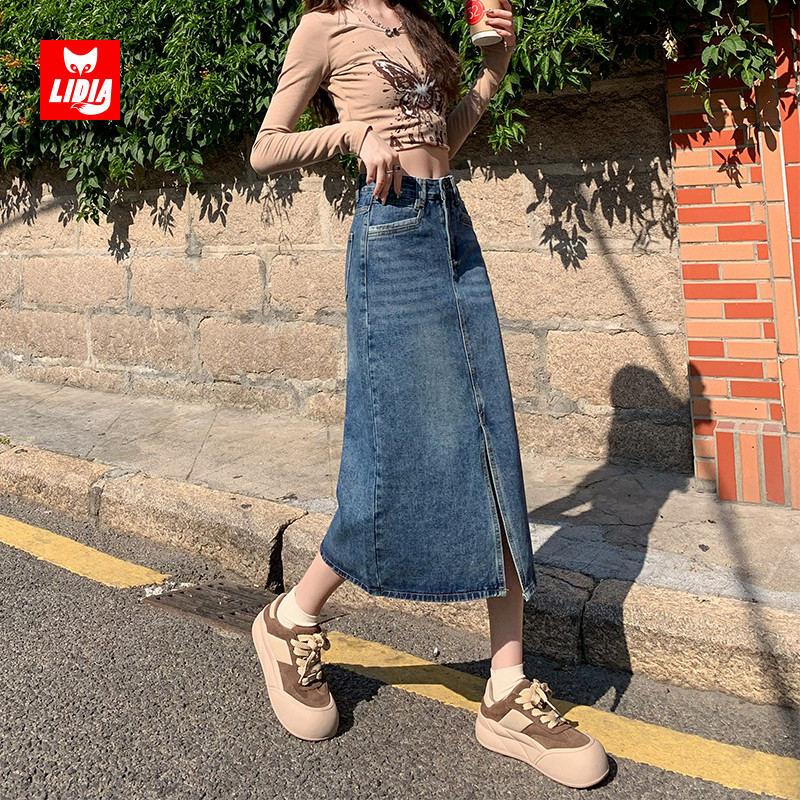 高腰开叉牛仔半身裙女2025年新款 遮胯a字小个子包臀裙 秋冬中长款