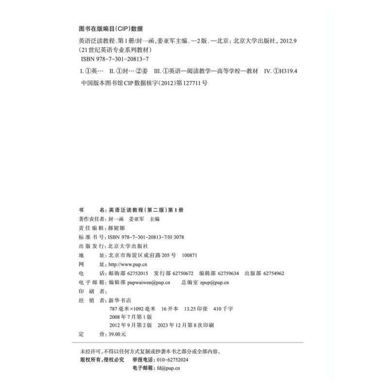 第1册 第二版 北京大学出版 2024新加印 社 21世纪英语专业系列教材 英语泛读教程 姜亚军 正版 封一函