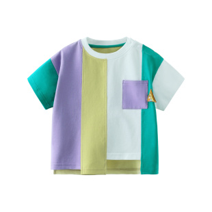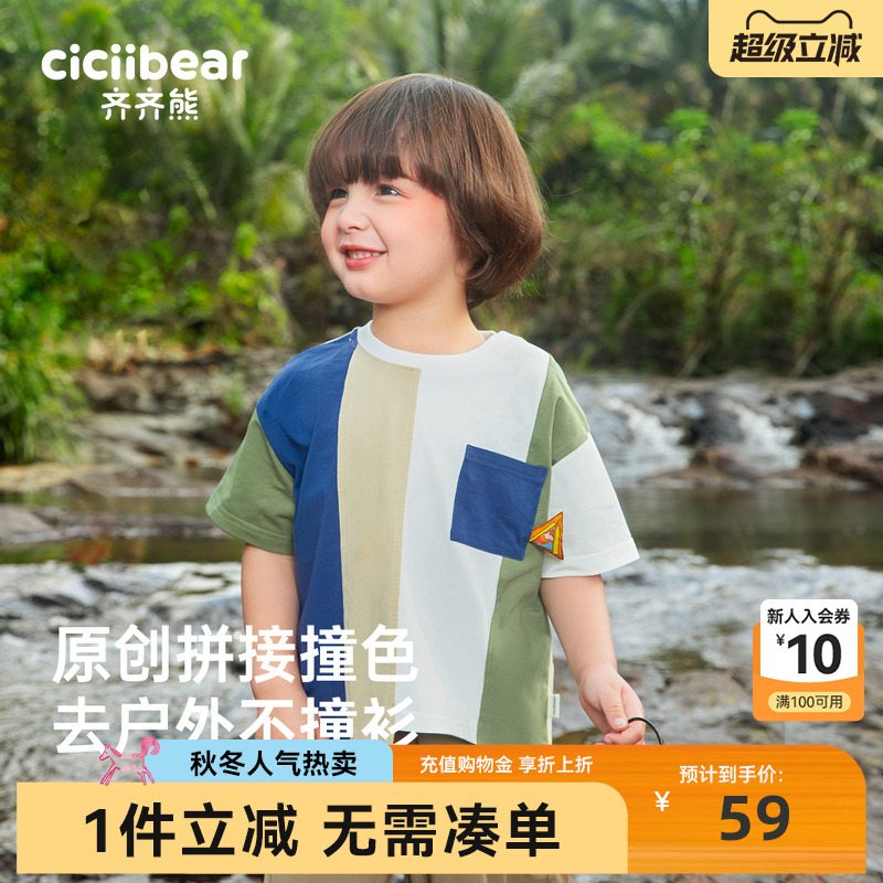 衣服中小童男宝宝拼接半袖 儿童夏季 齐齐熊男童t恤短袖 上衣 凉感