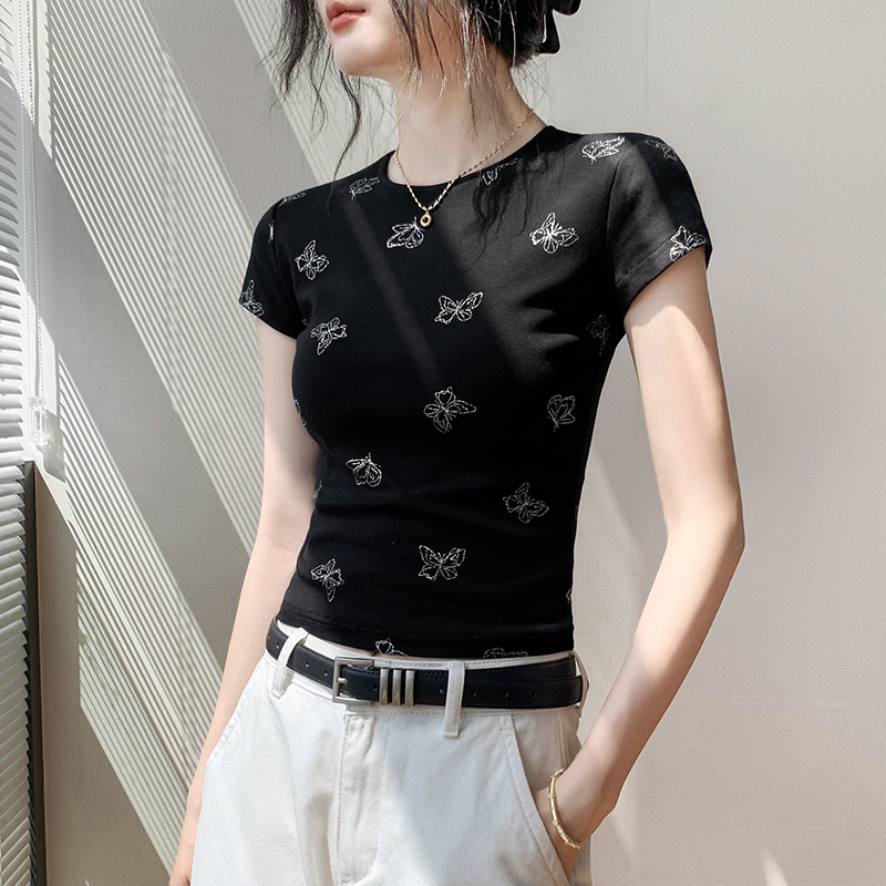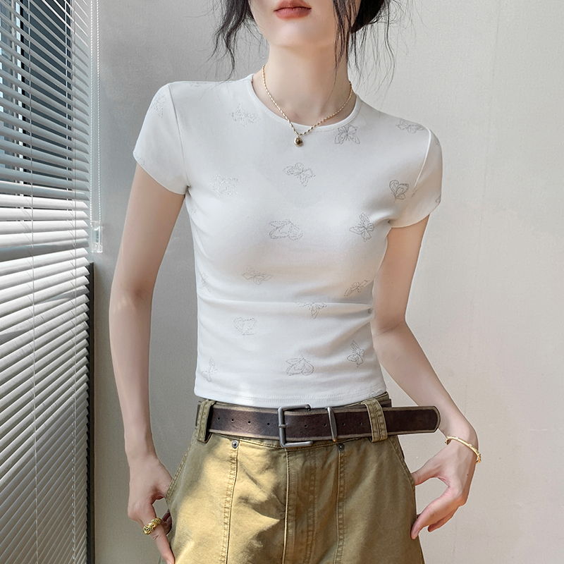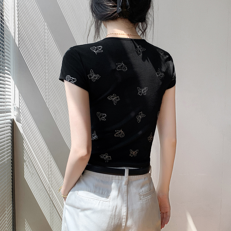 莱赛尔天丝蝴蝶烫钻圆领短袖 显瘦正肩别致设计感上衣 T恤女夏修身