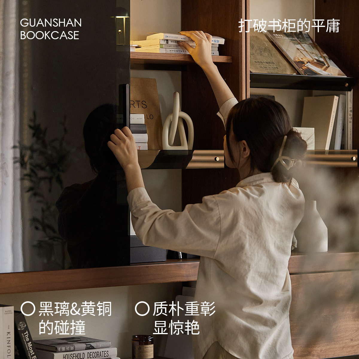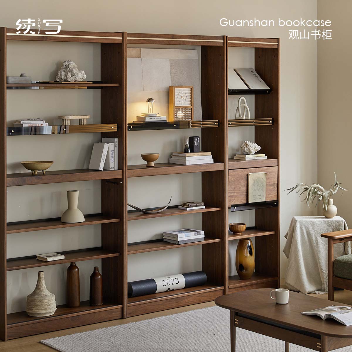 出乎生活观山书柜整墙黑胡桃木书架带玻璃门置物柜落地观山
