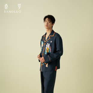 魔法小狗 藏青色100%桑蚕丝男家居服 桑罗日进斗金真丝睡衣套装
