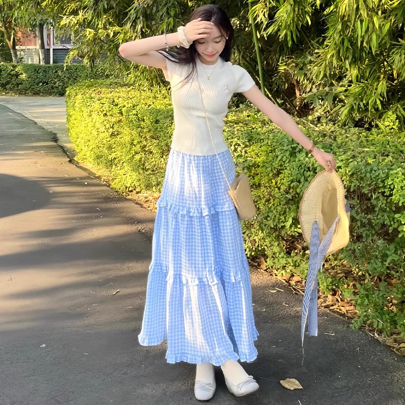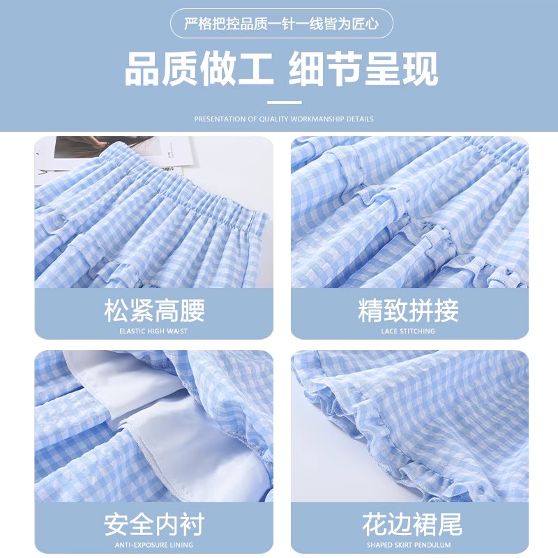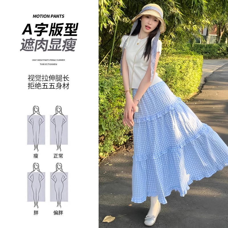 蛋糕蓬蓬裙 高腰显瘦a字大摆中长款 蓝色格子半身裙女2025新款 夏季