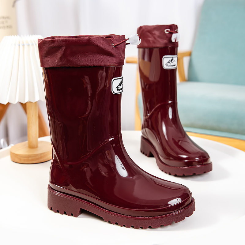 女中筒收口防泼水时尚 胶鞋 雨靴 女士户外露营防滑水靴水鞋 亮面雨鞋