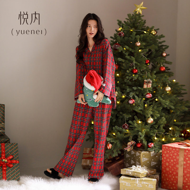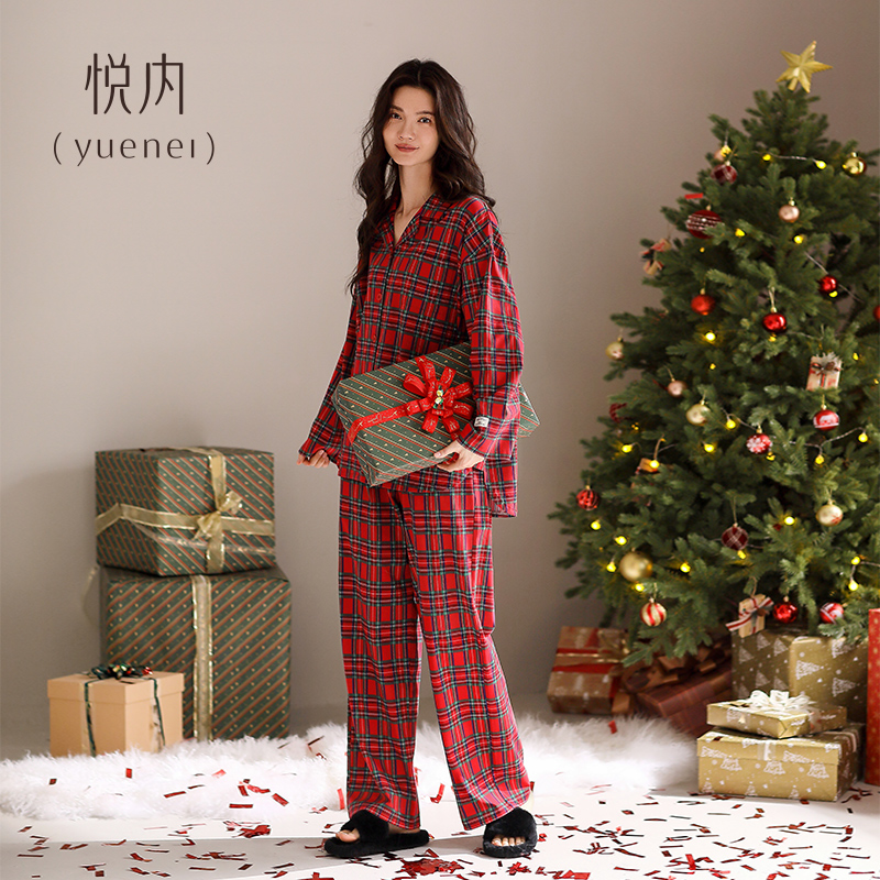 纯棉家居服格子本命年大红色新年礼物 长袖 悦内睡衣女士春秋款 秋季
