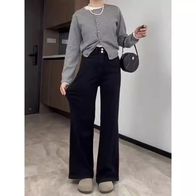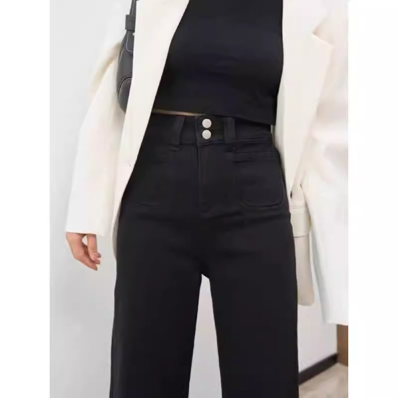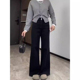 胖mm高腰遮胯弹力喇叭阔腿裤 大码 女秋冬新款 黑色不贴腿微喇牛仔裤