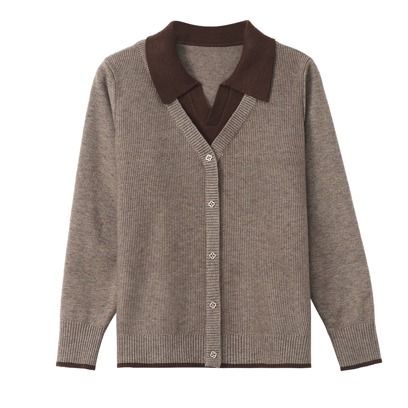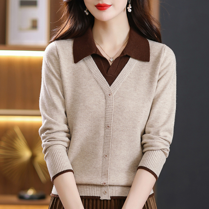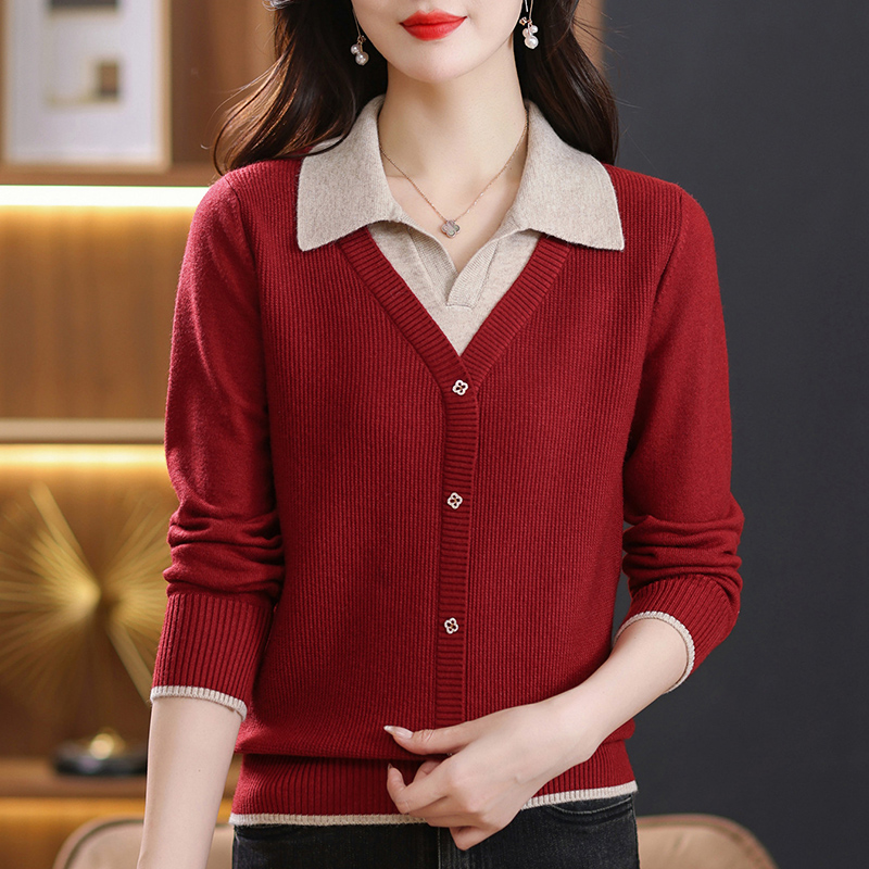 polo领宽松洋气针织衫 假两件拼接打底上衣女妈妈装 毛衣 新款 秋冬季