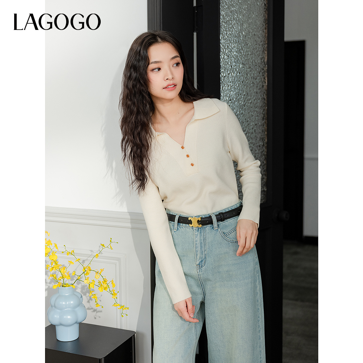 新款 女拉谷谷2025年秋季 V领百搭毛衣 针织衫 LAGOGO米白色淡人长袖