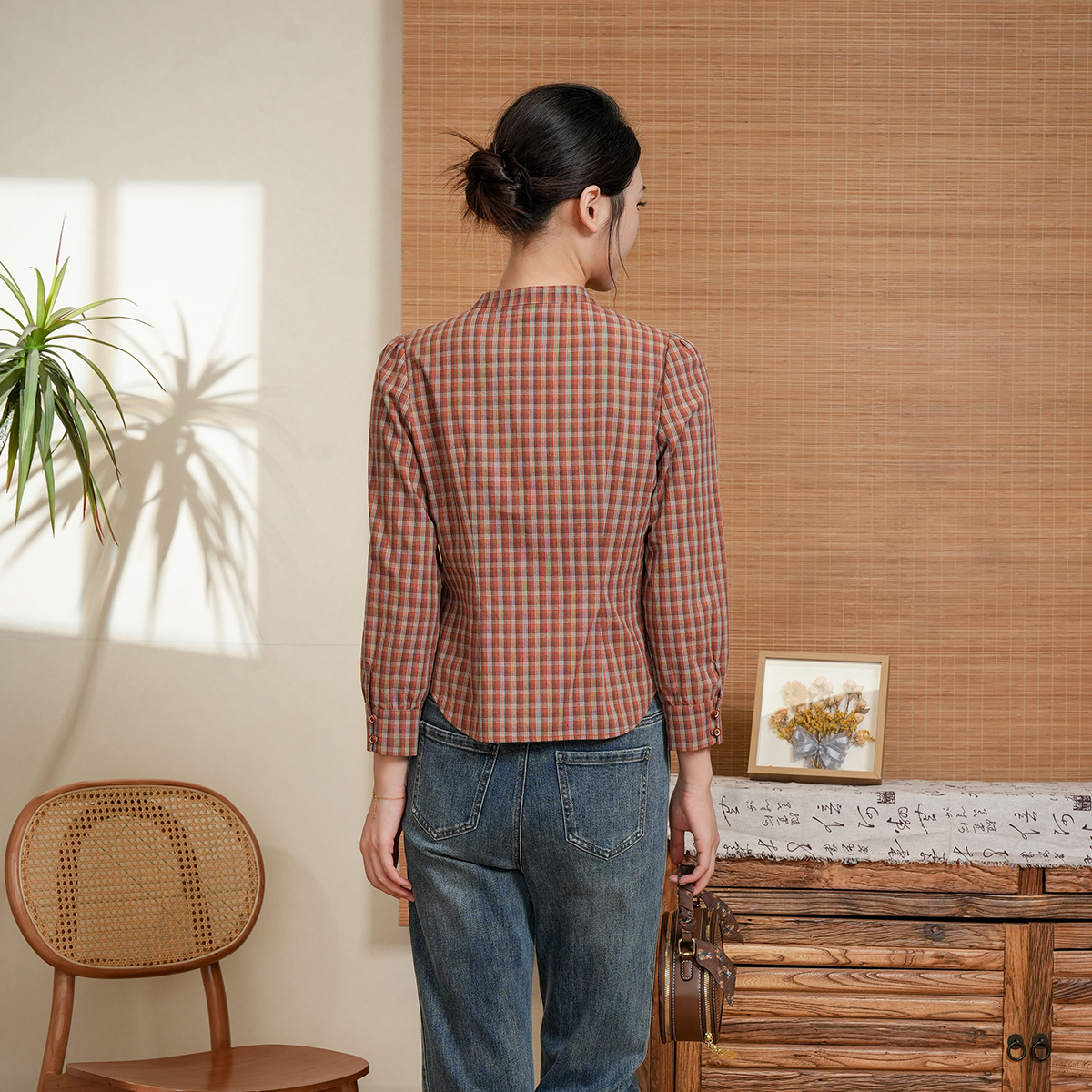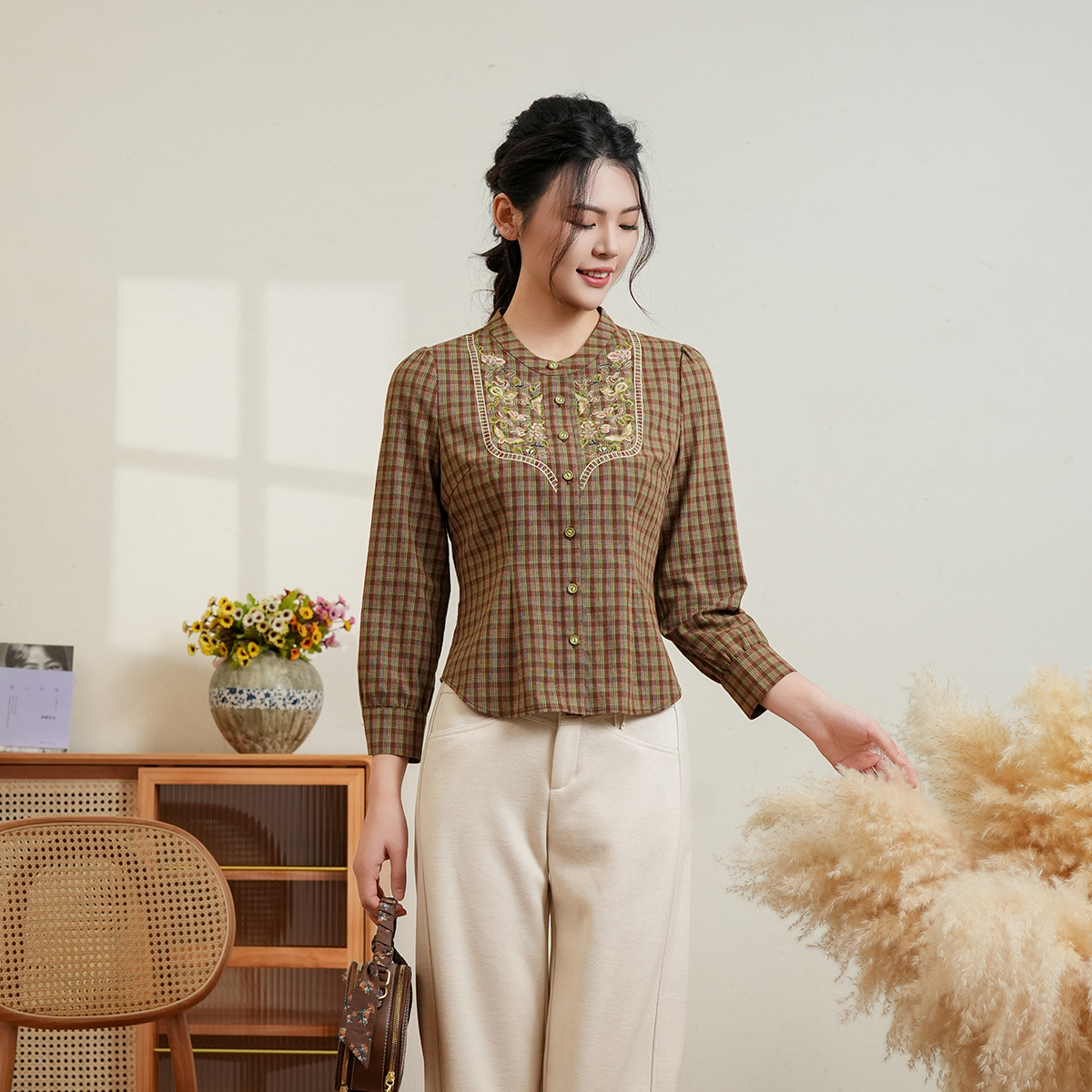 修身 衬衫 女士内搭上衣 格子造型门襟重工刺绣长袖 布符原创春秋新款