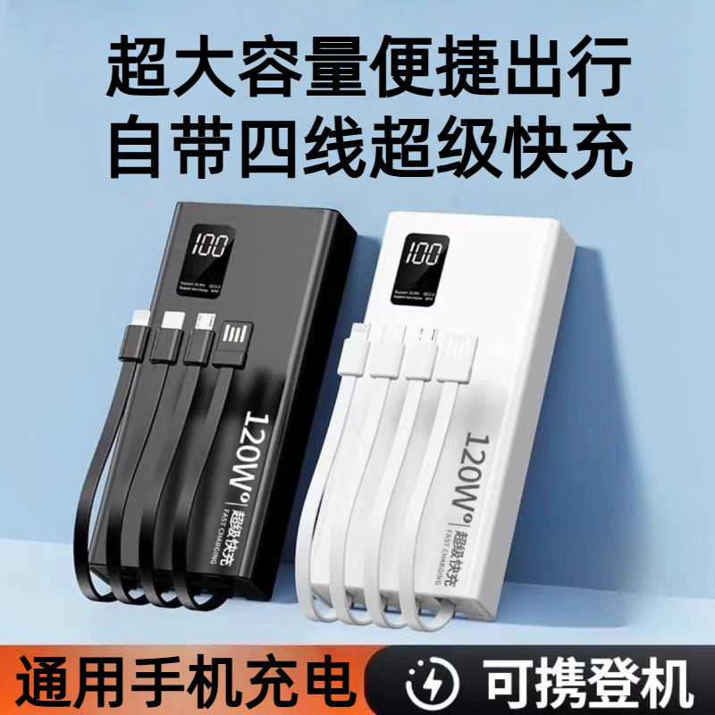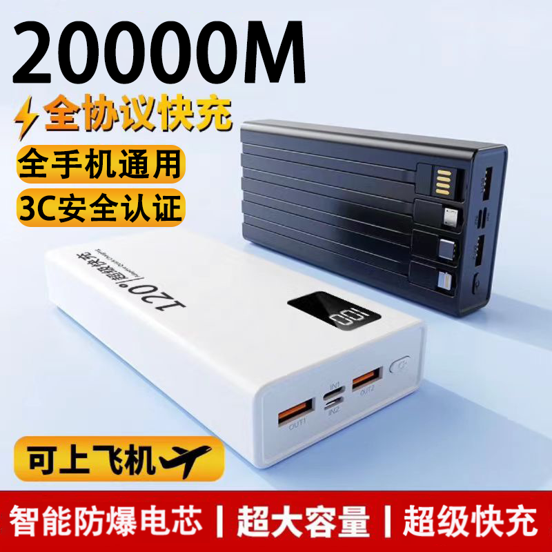 正品 超级快充电宝自带线20000毫安超大容量超薄便携数据线三合一户外移动电源适用华为苹果专用飞机可上