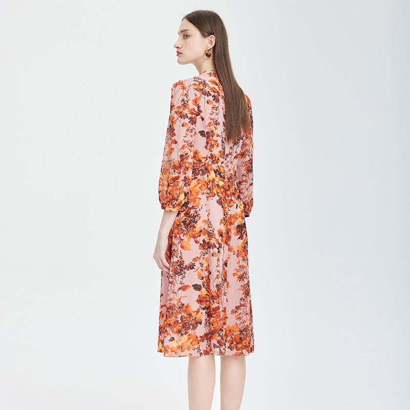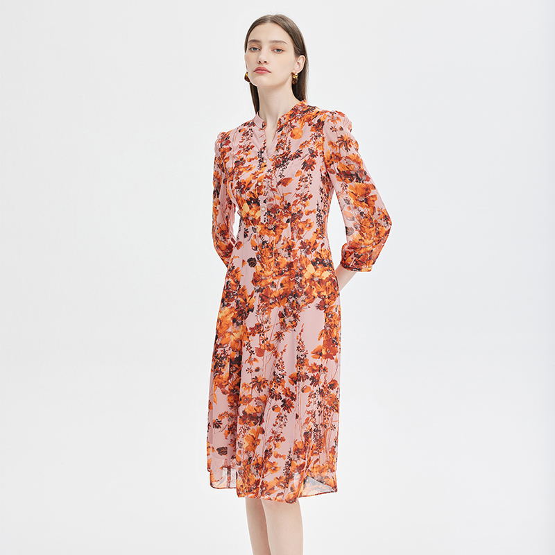 焦糖色V领印花连衣裙收腰长裙子时尚 春夏新款 马天奴女装 专柜正品