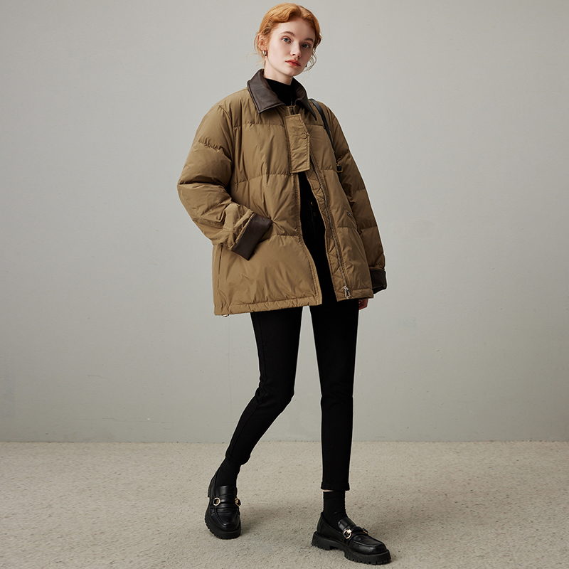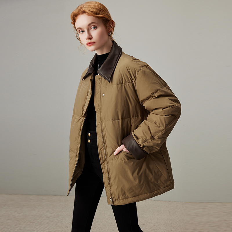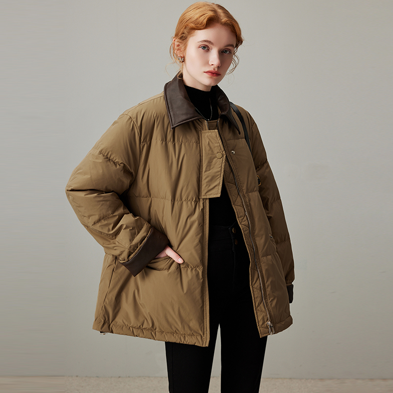 新款 轻薄羽绒服女2025年冬季 PU皮拼接白鸭绒保暖外套 短款 dfvc时尚
