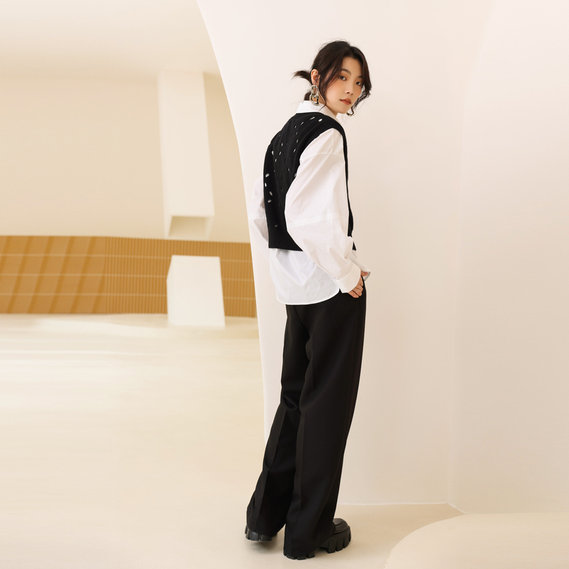 新款 女秋季 叠穿日系复古V领马甲背心 衬衫 白色抽绳设计感宽松长袖