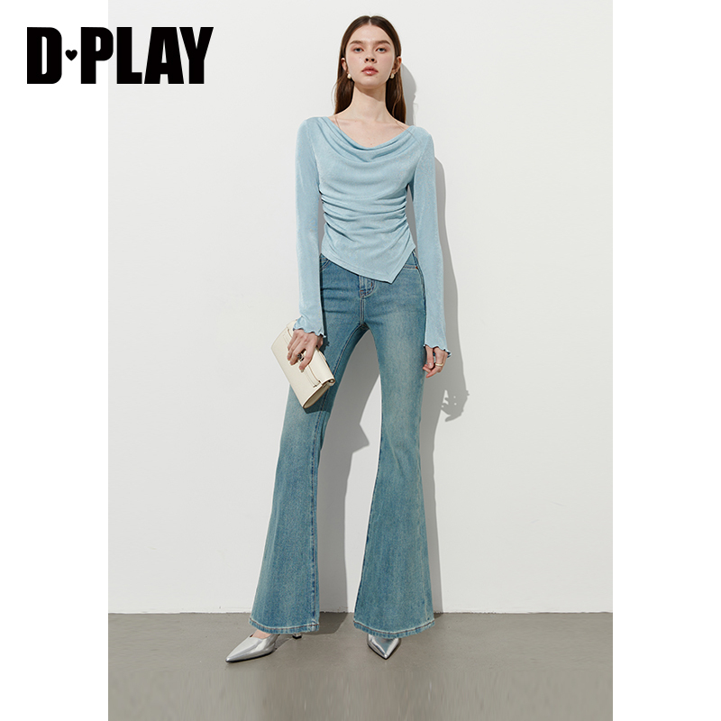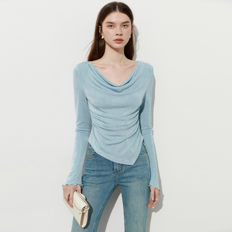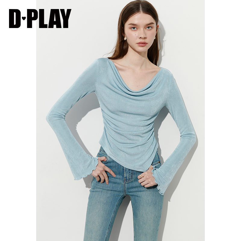 荡领气质上衣长袖 DPLAY2025年秋季 修身 蓝色t恤女法式 新款