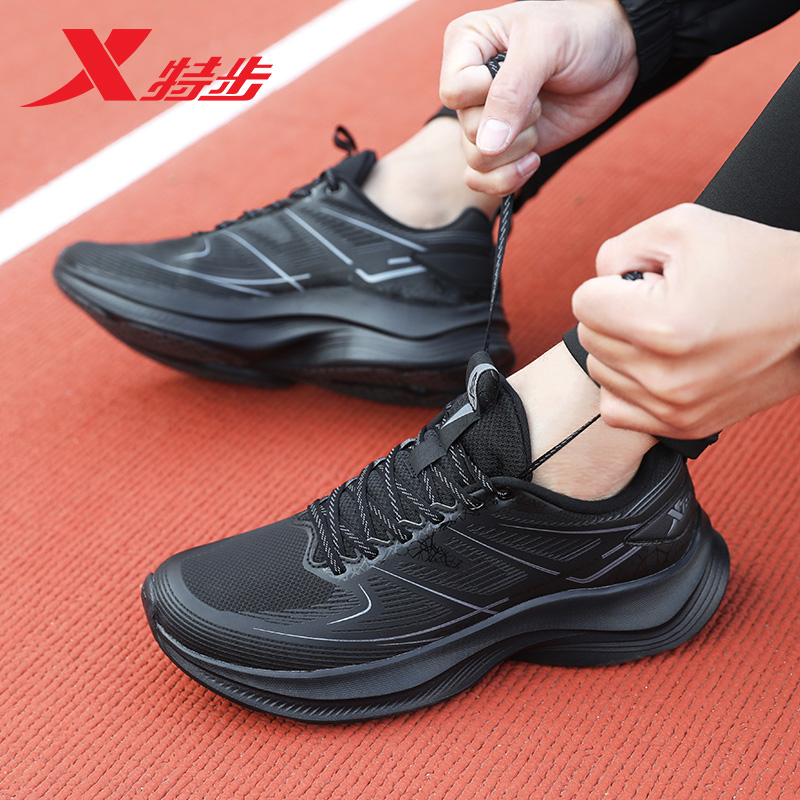 男2025秋季 轻便减震男鞋 皮面防水运动鞋 休闲鞋 黑色时尚 特步跑步鞋