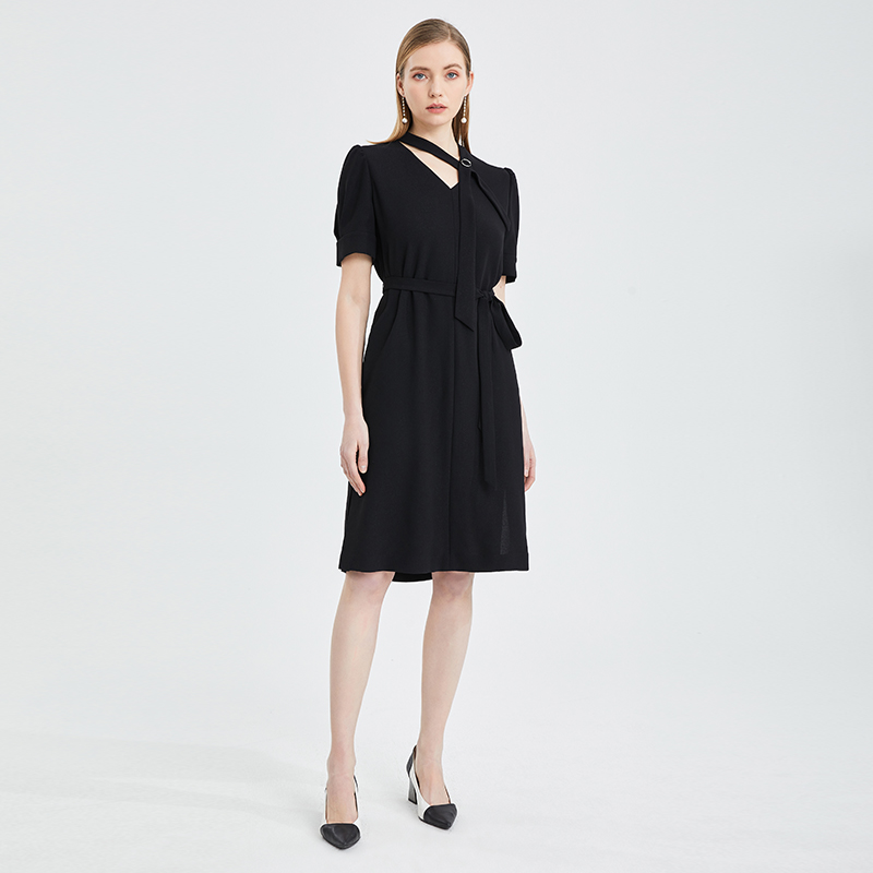 气质时尚 长裙夏季 女 马天奴黑色V领连衣裙子简约短袖 专柜正品