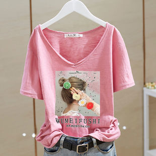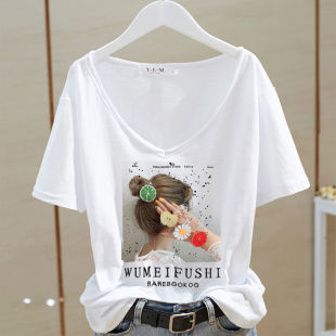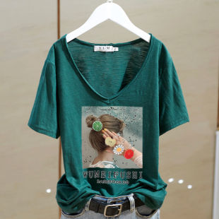 v领印花2025夏季 宽松大码 新款 韩版 潮 短袖 百搭上衣打底衫 t恤女韩版