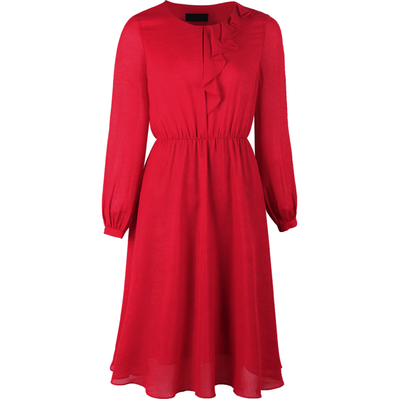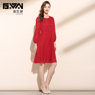 长袖 女惊艳红色连衣裙松紧腰遮肚显瘦中长款 雪纺裙 2025年新款 春装