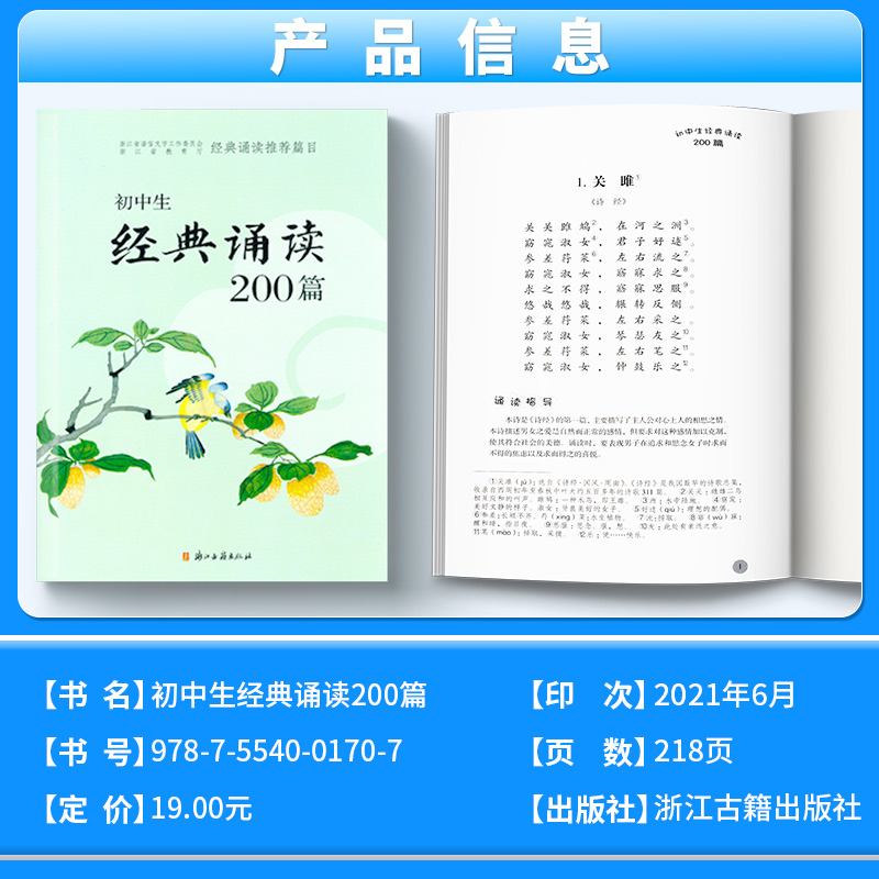 篇目浙江古籍出版 2024新版 诵读推荐 诵读200篇七年级八年级九年级文言文诗词背诵初中课内外古诗文阅读初中生国学经典 社 初中生经典