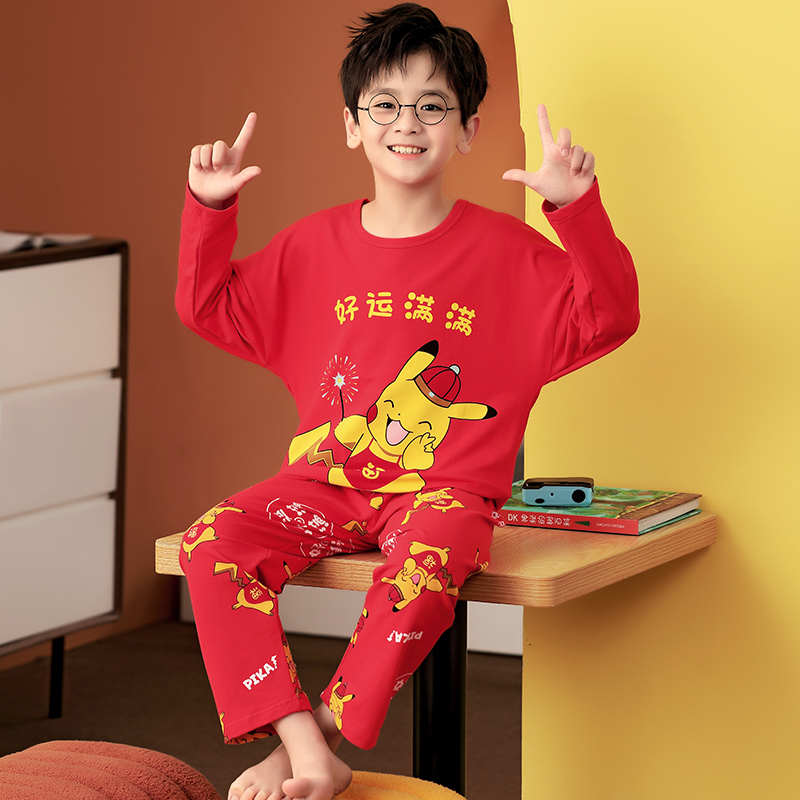 套装 12岁宝宝睡衣男孩 儿童男童秋款 家居服男童秋冬红色纯棉长袖