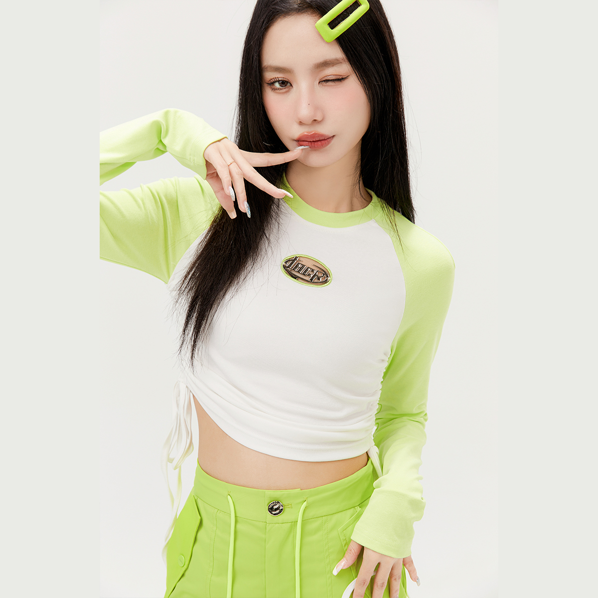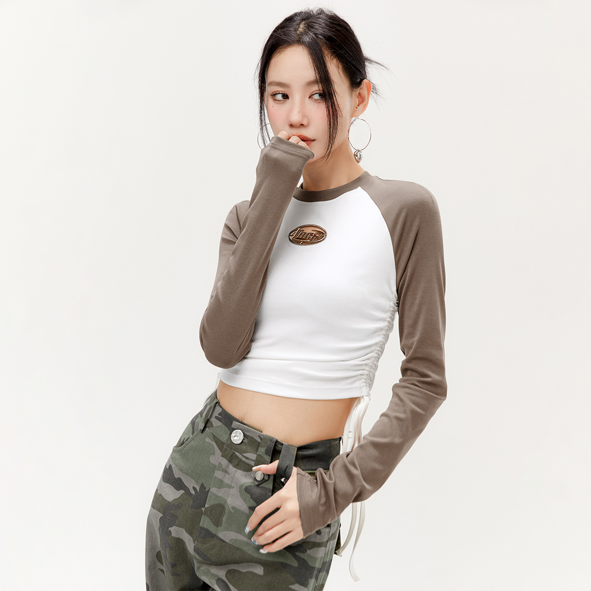 撞色长袖 复古辣妹紧身抽绳插肩袖 T恤女 LACRAWFISH美式 李紫婷同款