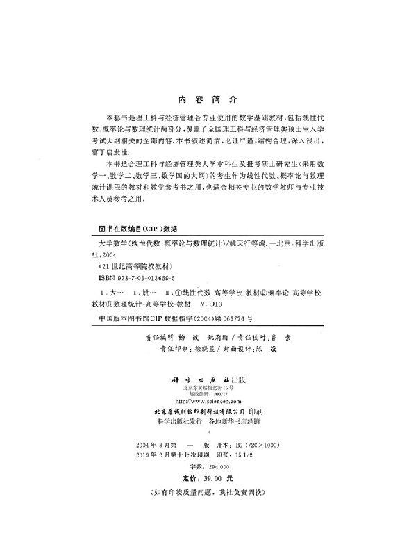 数学 姚天行 科学出版 线性代数 社9787030136695 滕利邦 概率论与数理统计 孔敏 大学数学 朱乃谦