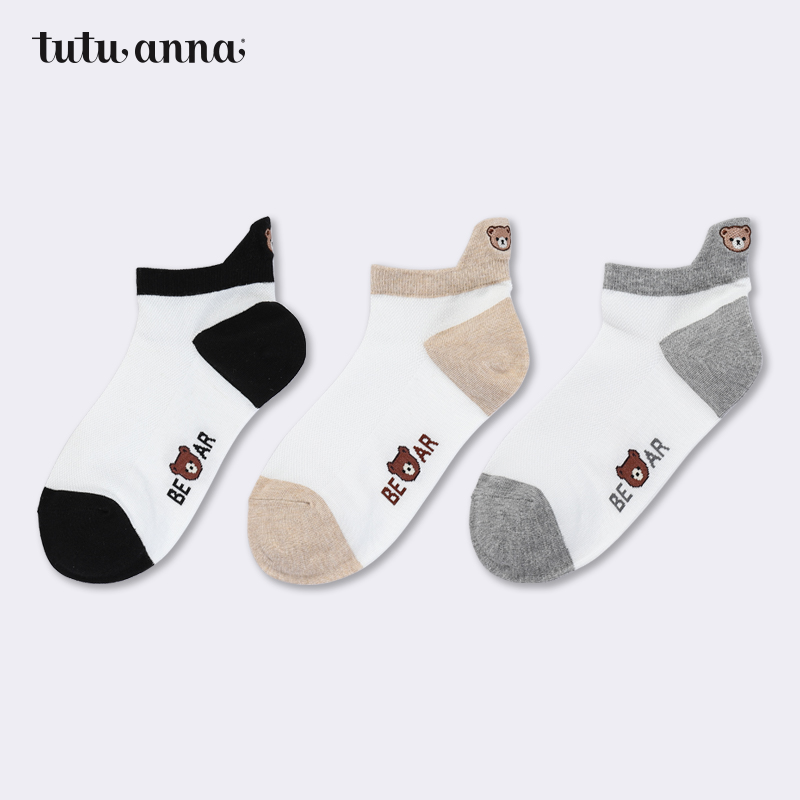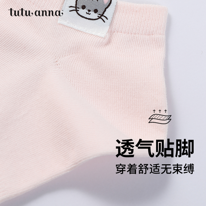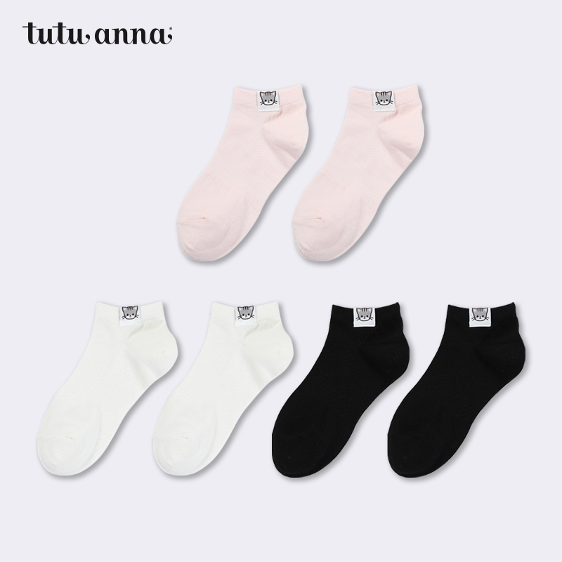 tutuanna袜子 春秋棉质透气不勒脚纯色袜口喵咪标签船袜短袜 女