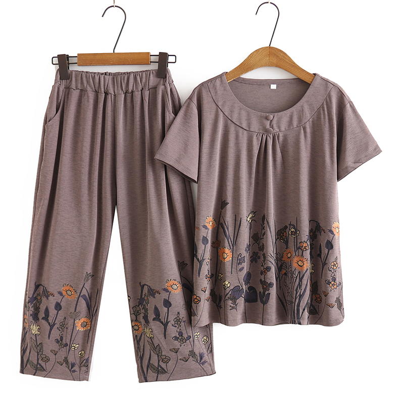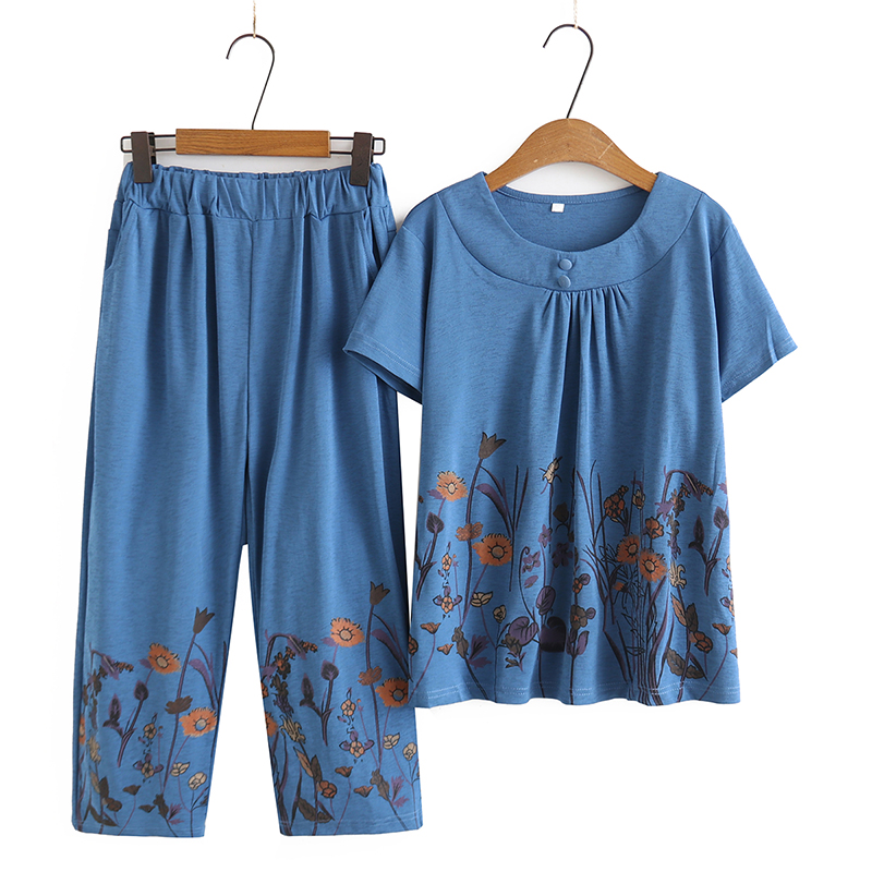 夏款 子套装 大码 t恤裤 女 女士印花两件套女中老年胖妈妈短袖 奶奶装