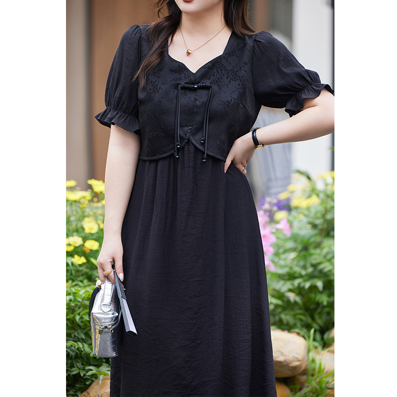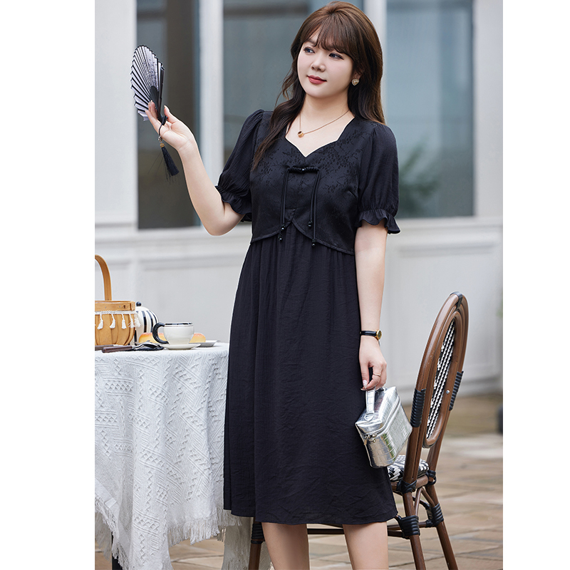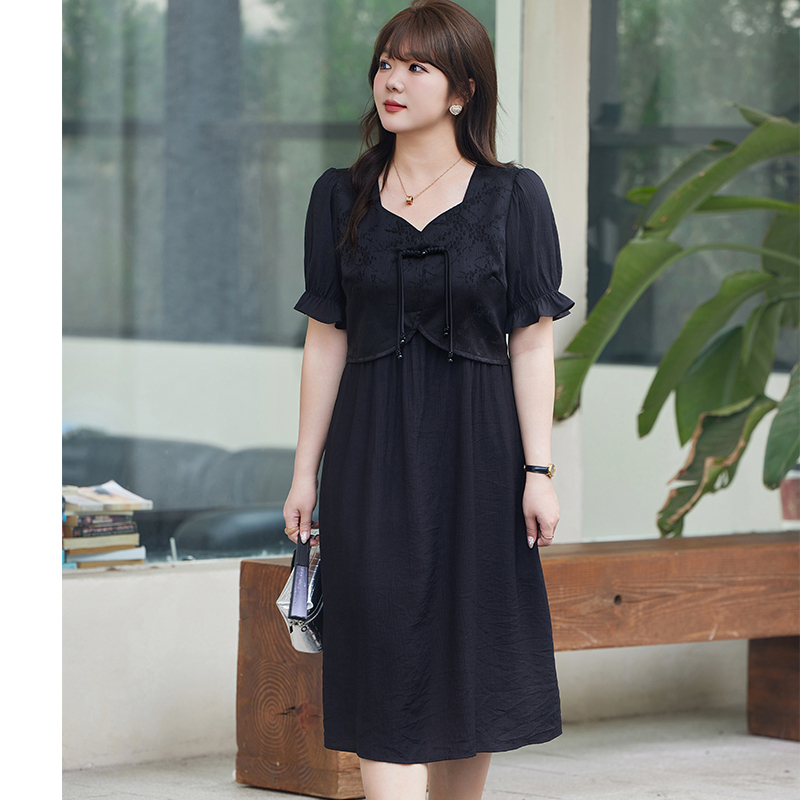 大码 2024年夏装 国风小黑裙显瘦短袖 气质方领新中式 胖mm连衣裙 新款