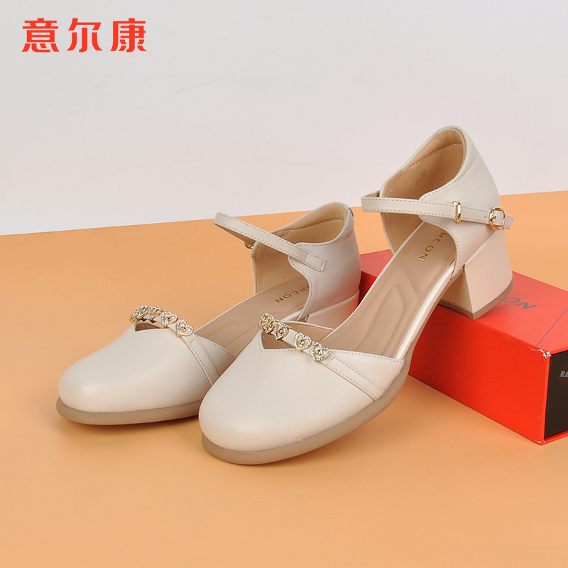 一字带女鞋 意尔康包头凉鞋 高跟包跟中空粗跟法式 夏季 女2024新款