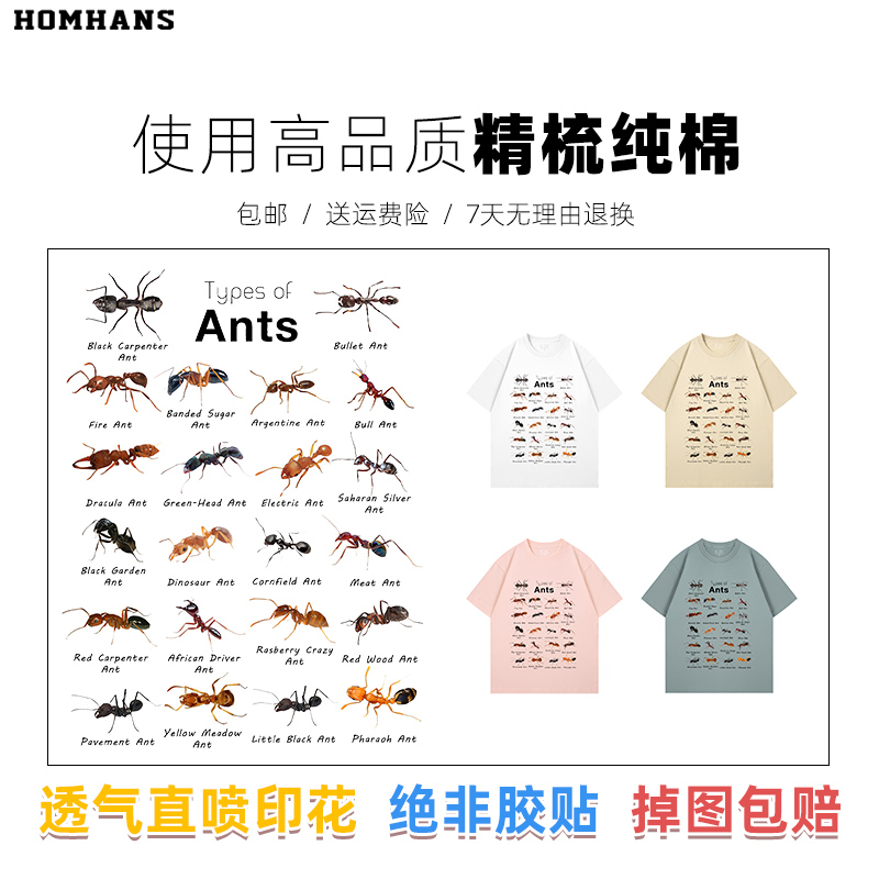 不掉图 纯棉成人儿童亲子 蚂蚁合集工蚁火蚁动物昆虫 透气印花短袖