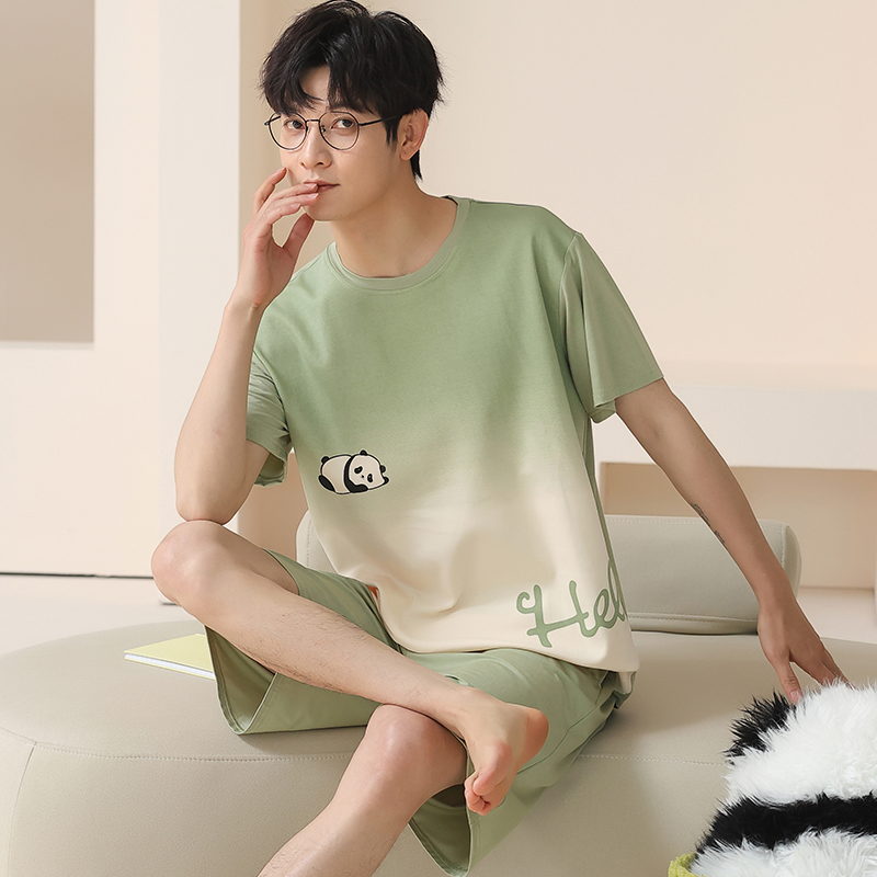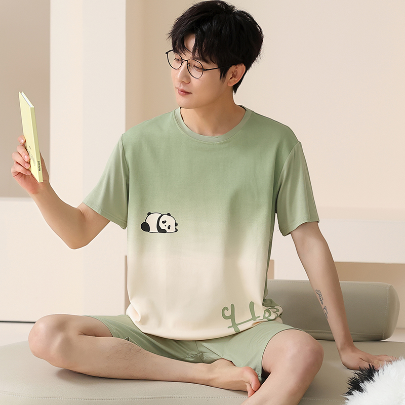 渐变色套装 卡之恋睡衣男夏季 短裤 圆领短袖 熊猫卡通家居服 纯棉薄款