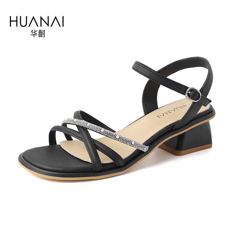女款 厚底一字带高跟鞋 外穿夏季 女士粗跟法式 2025新款 华耐黑色凉鞋