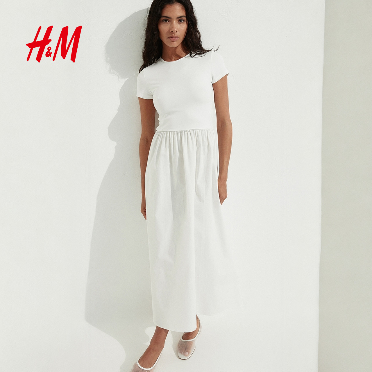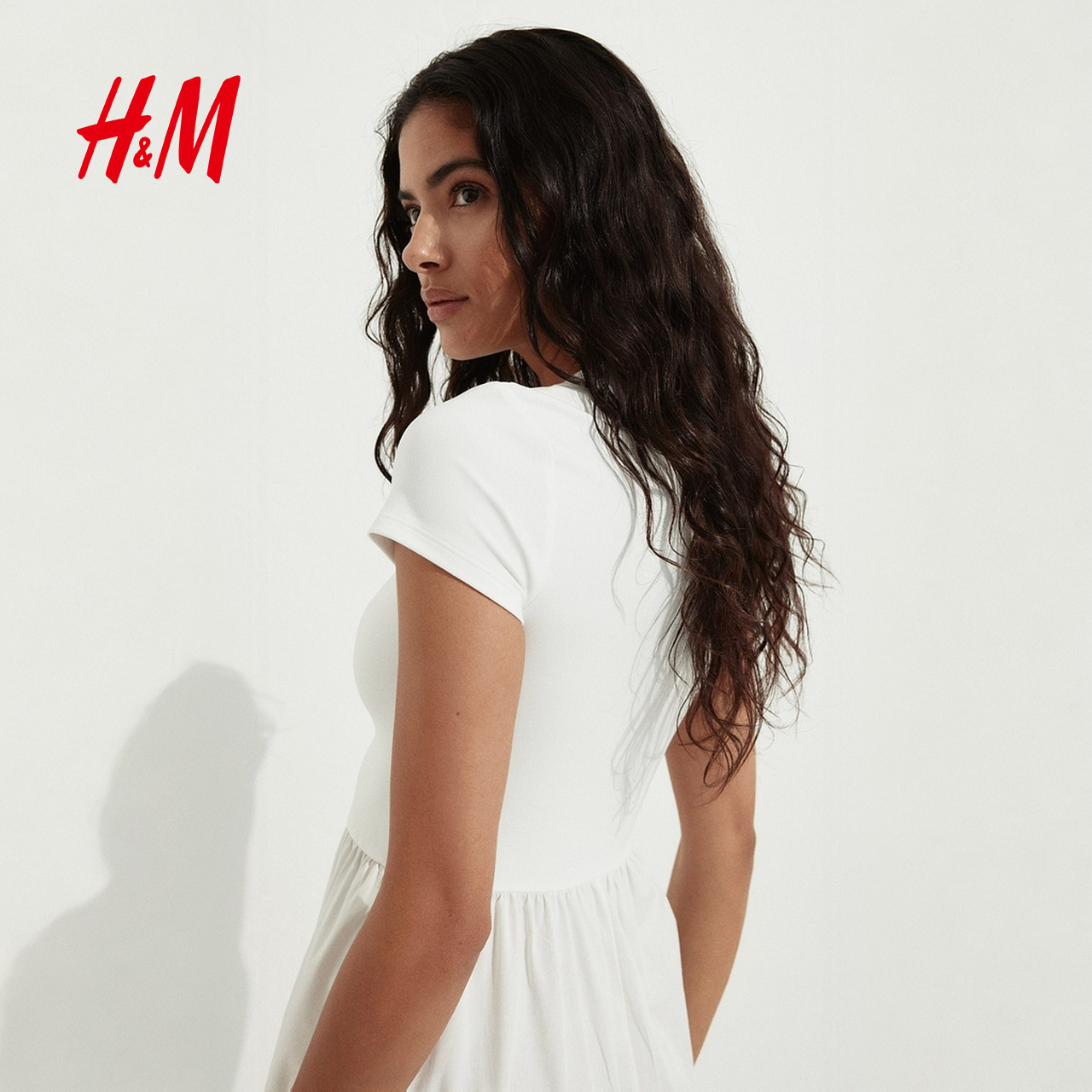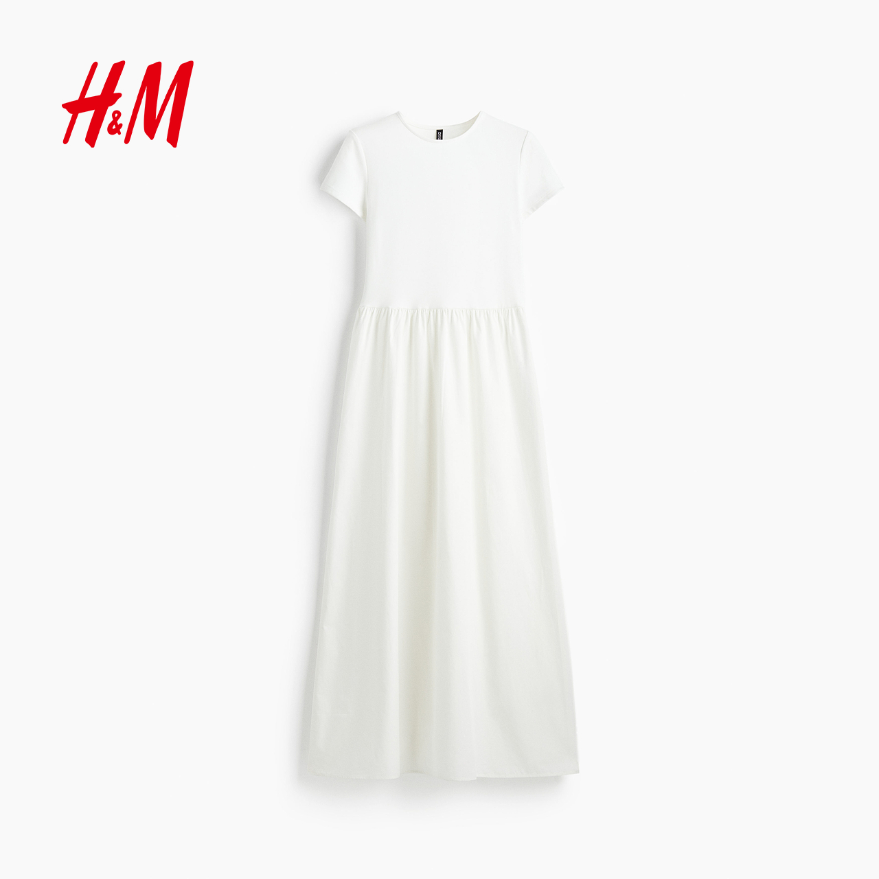 长款 HM女装 气质优雅短袖 新款 正肩连衣裙1295352 连衣裙2025夏季