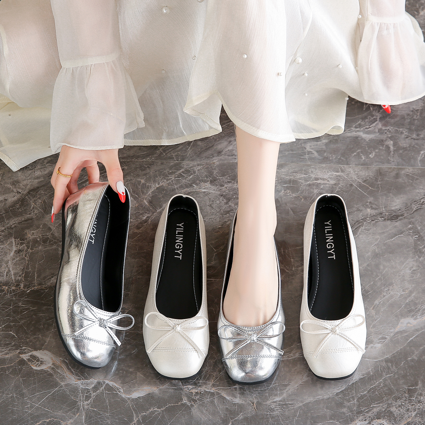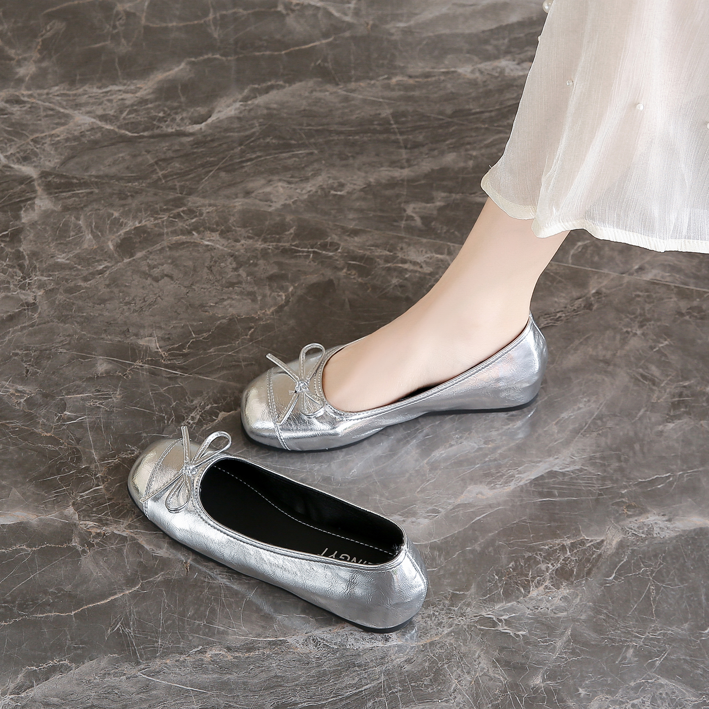 女2025年夏季 一脚蹬女鞋 新款 方头浅口单鞋 子 法式 热风银色平底单鞋