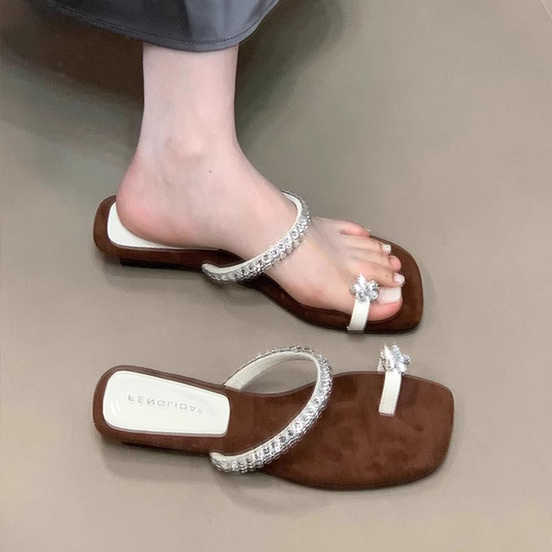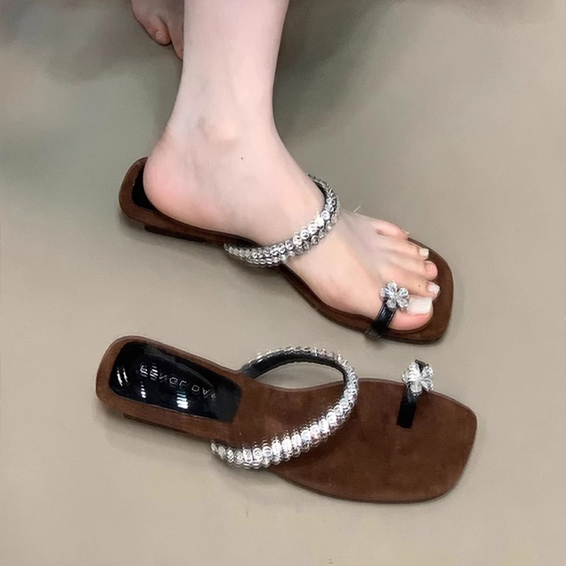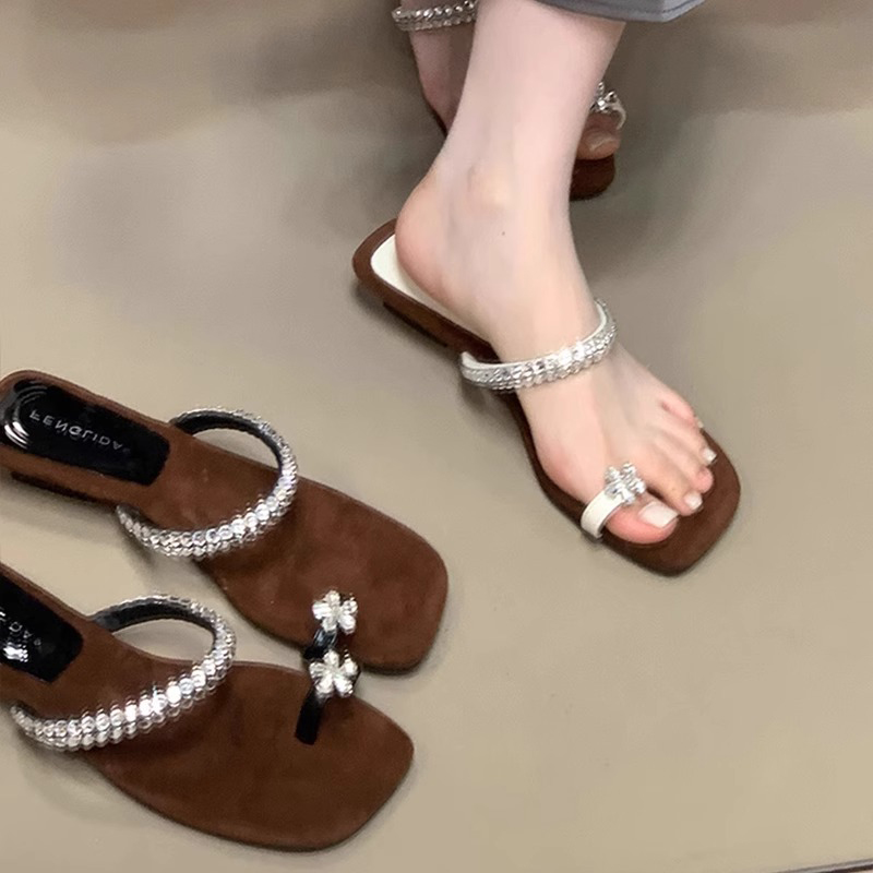绝美配裙子度假沙滩一字凉鞋 水钻方头套趾凉拖鞋 女夏外穿2025新款