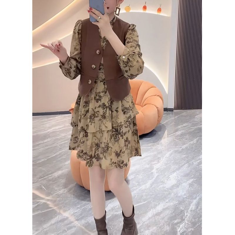 气质显瘦马甲搭配长袖 时尚 新款 女2025年秋季 印花裙两件套 百搭套装