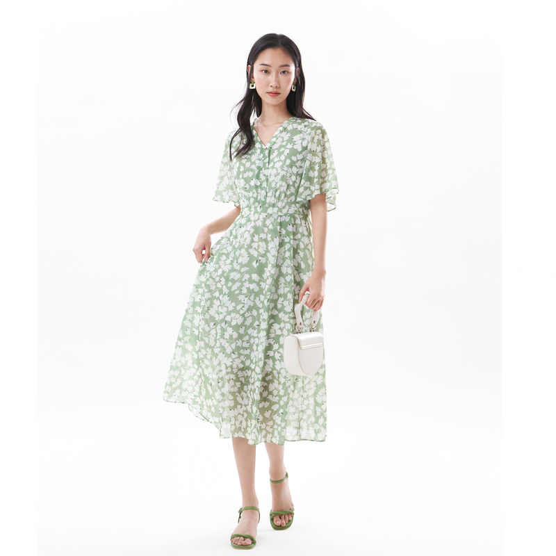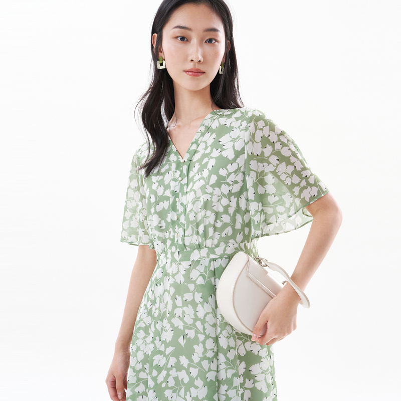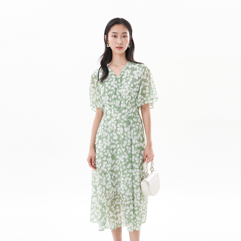 中长款 易菲V领印花雪纺优雅气质收腰短袖 Yifini 连衣裙 专柜同款