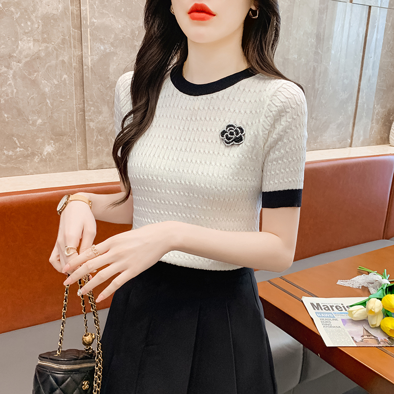 潮钉珠山茶花撞色上衣显瘦冰丝针织衫 短袖 2025新款 薄款 t恤女夏季