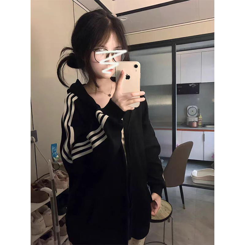 外套chic慵懒开衫 美式 复古潮牌三条杠连帽卫衣女春秋oversize薄款