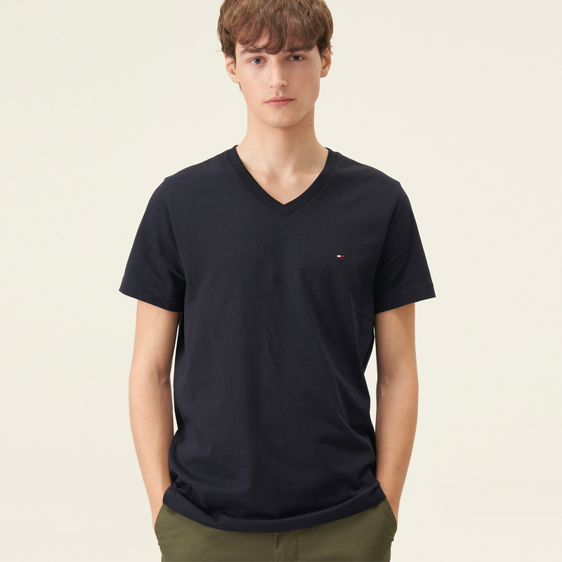 短袖 美国正品 纯色圆领打底衫 HILFIGER汤米男士 T恤刺绣V领棉 TOMMY