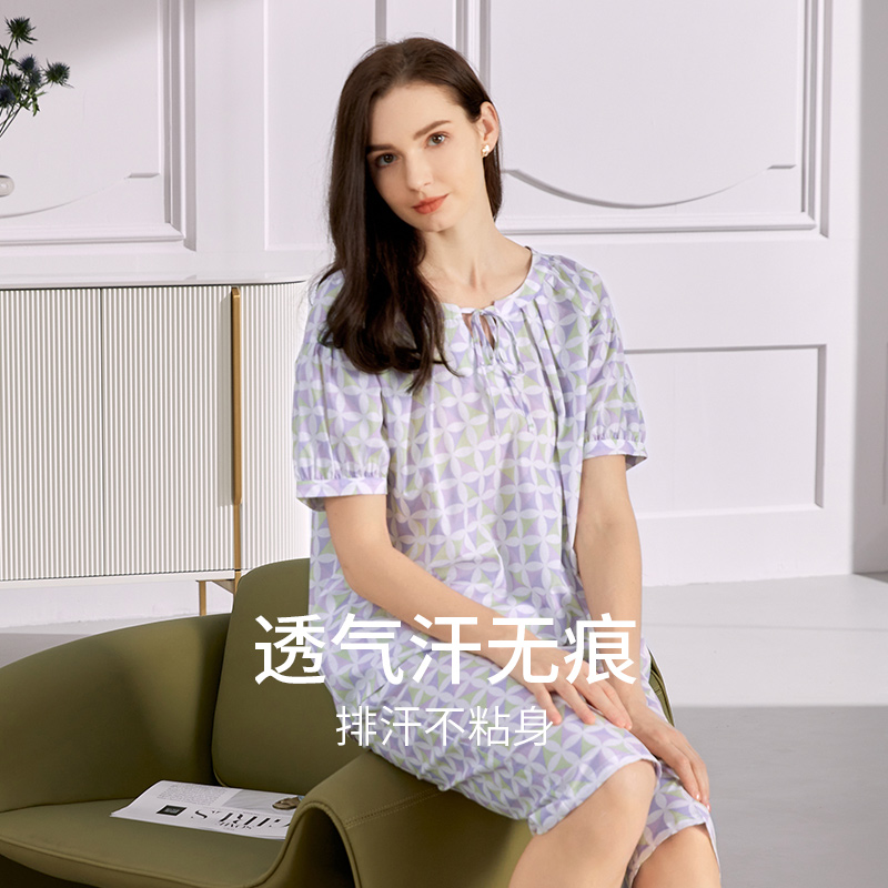 女款 秋鹿梭织家居服女夏薄款 纯棉睡衣夏款 七分裤 甜美印花V领短袖