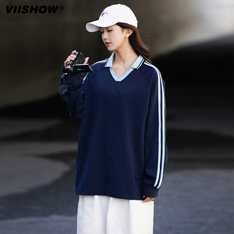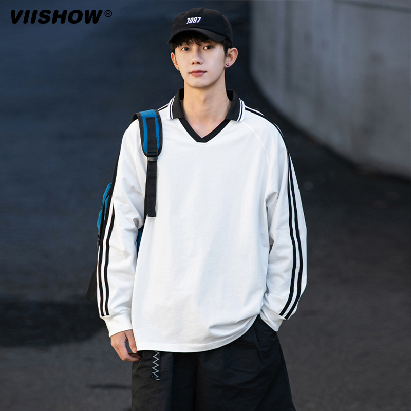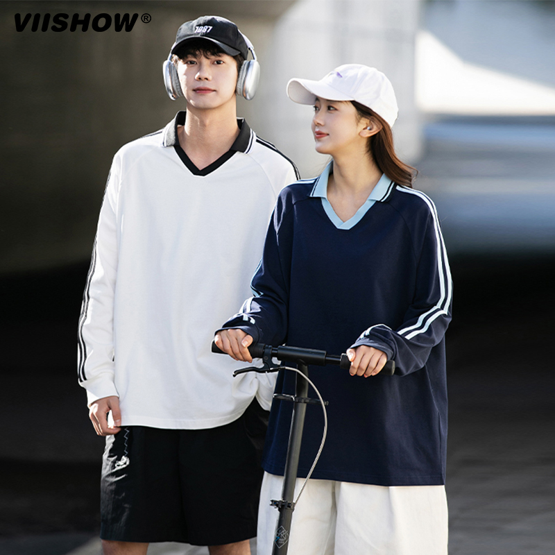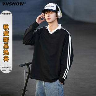 T恤宽松百搭男女同款 设计感拼色微V翻领长袖 上衣 男士 VIISHOW春季