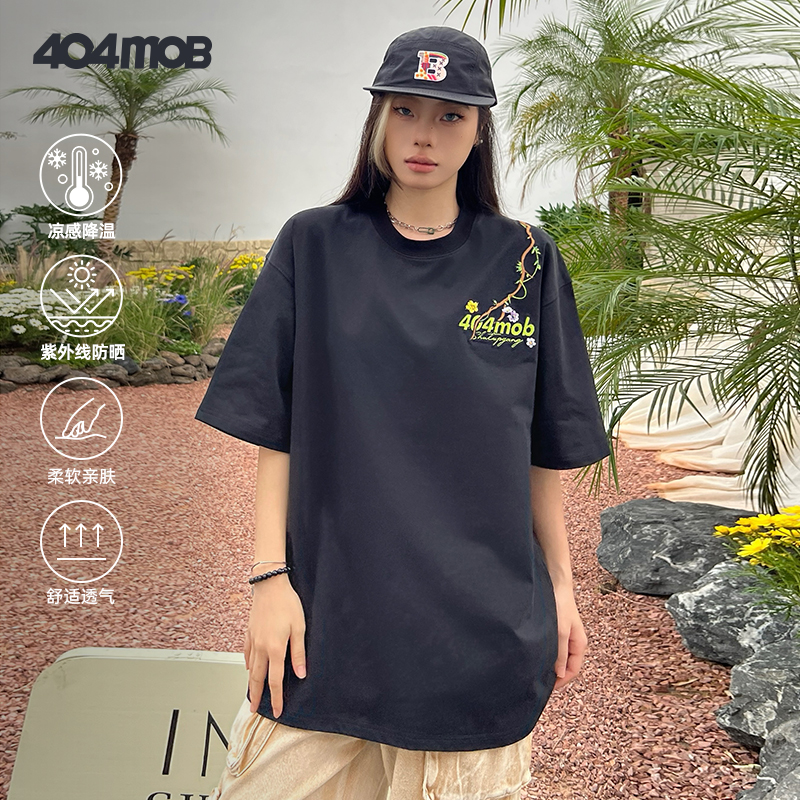 404MOB重工藤蔓花卉刺绣短袖 潮牌冰感防晒复古情侣体恤t T恤男美式