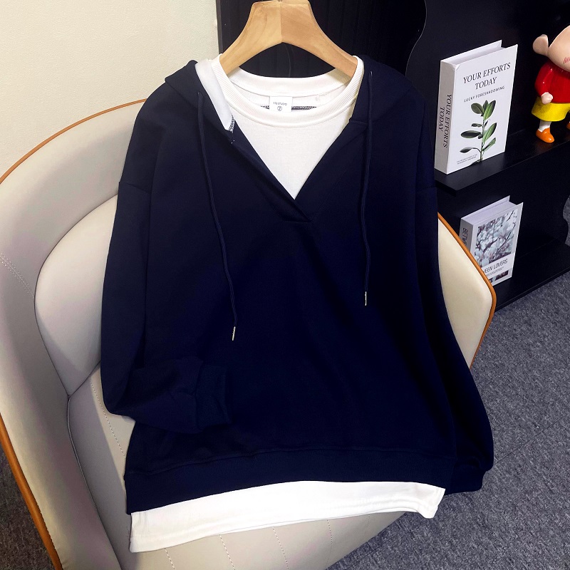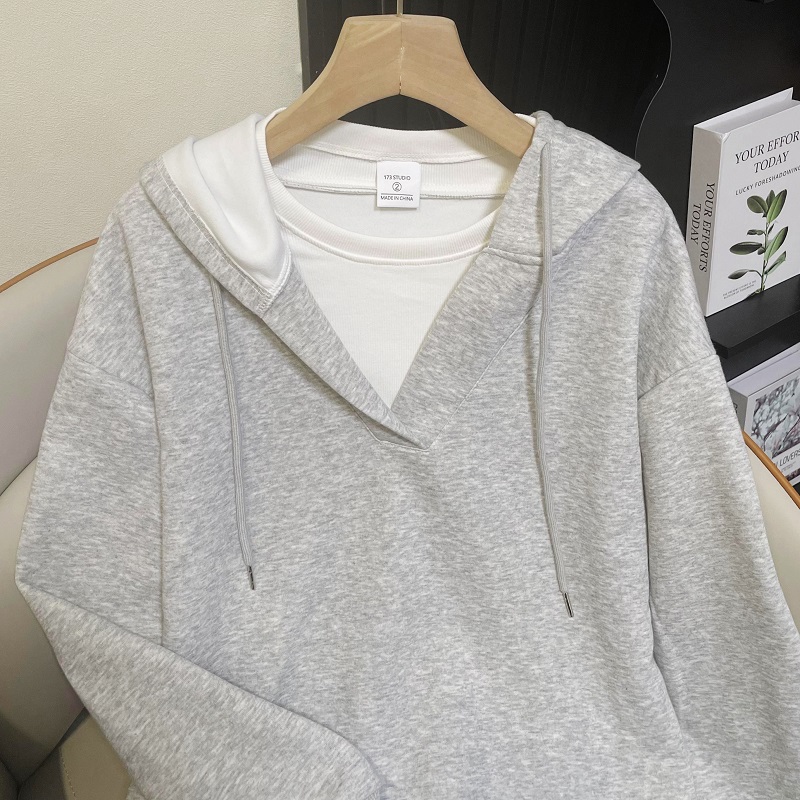 Fjwldy假两件连帽卫衣女2025早秋新款 胖mm外套遮肚子显瘦上衣 大码